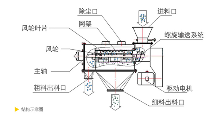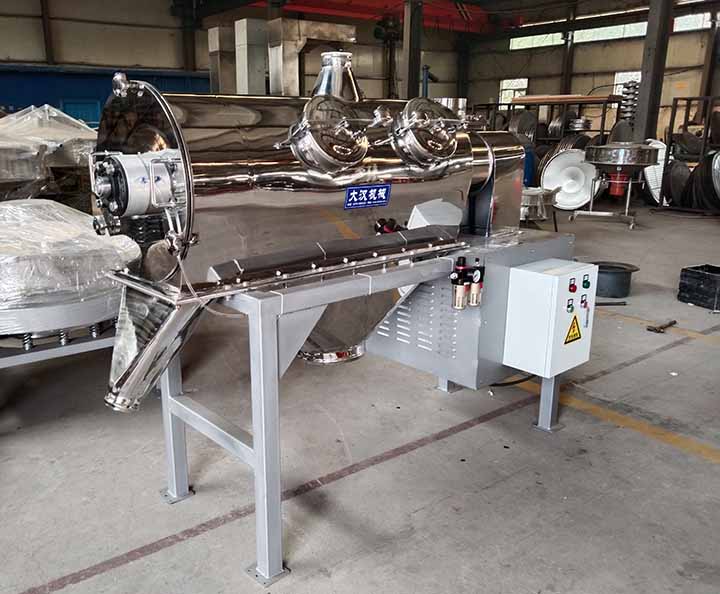 離心式篩分機從外觀上看上部為水平放置的圓柱形、下部為圓錐形的密閉容器,篩機下面有支腿以支撐整個篩機。電機通常位于設(shè)備頂部或底部,通過皮帶或直接驅(qū)動主軸。進料口通常在筒的一端或頂部,物料通過管道或漏斗送入。出料口有兩處,一處是細顆粒出口,一處是大顆粒出口,一般在筒的另一端或筒側(cè)面。