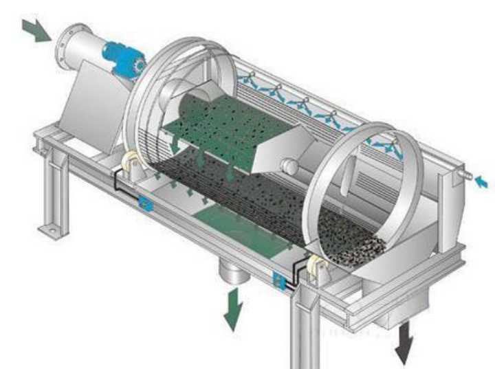 滾筒篩沙機主要有振動電機、減速機、滾筒裝置、機架、密封蓋、進出料口等部分組成,滾筒裝置傾斜安裝在機架上,電機經(jīng)減速機與滾筒裝置通過聯(lián)軸器連接在一起,驅(qū)動滾筒裝置繞其軸線轉(zhuǎn)動。