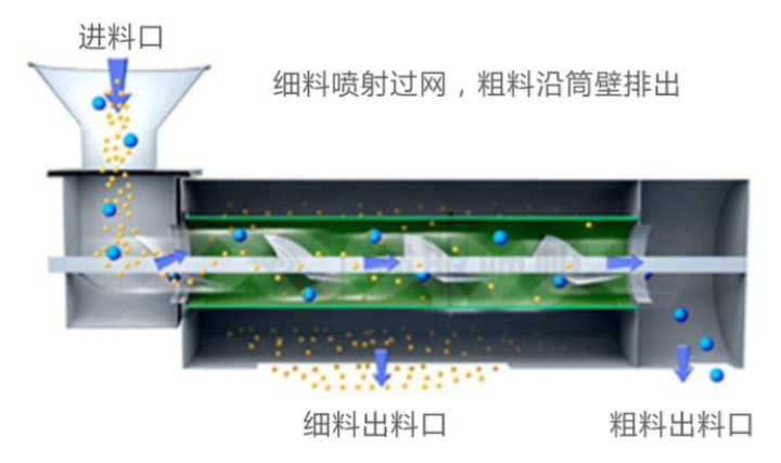 WQS氣旋篩由于形狀為橫臥狀所以也叫臥式氣流篩或臥式氣流篩分機(jī) ,網(wǎng)為圓筒狀,置于機(jī)體內(nèi),物料通過螺旋輸送系統(tǒng)后,和氣流混合、霧化進(jìn)入網(wǎng)筒內(nèi);通過網(wǎng)筒內(nèi)風(fēng)輪葉片使物料同時(shí)受離心力和旋風(fēng)推進(jìn)力,從而近使物料噴射過網(wǎng),由細(xì)料排出口排出,不能過網(wǎng)的物料沿網(wǎng)筒壁從粗料排出口排出。