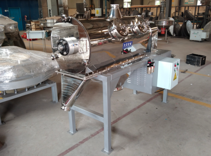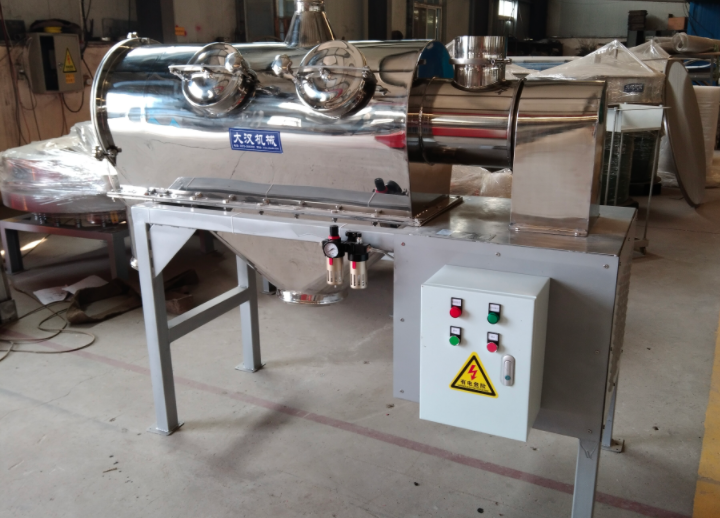 臥式氣流篩也叫氣旋篩,置于機(jī)體內(nèi),物料通過螺旋輸送系統(tǒng)后,和氣流混合、霧化進(jìn)入網(wǎng)筒內(nèi);通過網(wǎng)筒內(nèi)風(fēng)輪葉片使物料同時(shí)受離心力和旋風(fēng)推進(jìn)力,從而近使物料噴射過網(wǎng),由細(xì)料排出口排出,不能過網(wǎng)的物料沿網(wǎng)筒壁從粗料排出口排出。